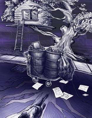 Afuera está la señora que empuja su carrito hecho de tambos oxidados. Acumula, como todos los días, las hojas de ese árbol, el mismo que con ráfagas de viento toca con sus ramas mi ventana haciendo un chillante ruido como el de unas uñas al ras del vidrio y que por las noches se dibuja en la pared como un árbol típico de pesadilla infantil, expandiendo y contrayendo su tamaño, acercándose y alejándose de mi…