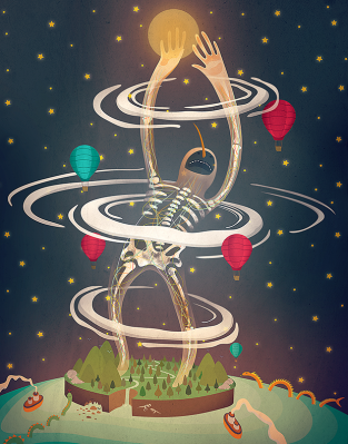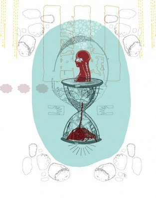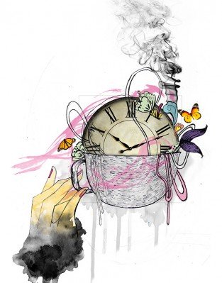 El dinosaurio que camina lento –absurdo, atento y exuberante–, tenía pendiente una visita con el tiempo. Paso a paso emprendió un viaje sin regreso hacia donde las manecillas del reloj no dan vuelta. Quería viajar al pasado y, quizá, un poco más allá. Tic-tac, tic, tac. Paso a paso más lento que un segundo. Las horas se transformaron en años, los días en siglos y así pasaron los meses sin llegar a ningún lado. Tal…