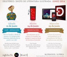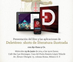 Extracto: Despega Deletéreo, shots de literatura ilustrada servidos para fomentar la lectura, promover nuevos autores y enriquecer nuestra rutina con un poco de cultura. Del 21 al 27 de junio, Deletéreo llevará a cabo 3 actividades para envolver al público en el mundo interdisciplinario y refrescante de la literatura ilustrada. Deletéreo es un bar virtual, fundado en agosto de 2012, en el que se publica diariamente un texto corto ilustrado o, usando el término que han acuñado, un «shot de literatura ilustrada».